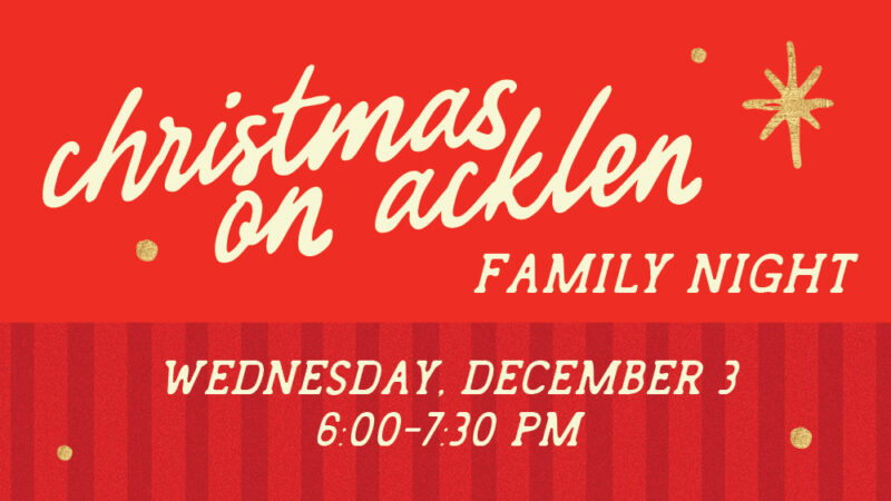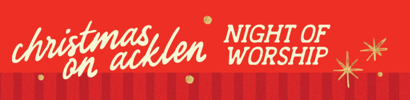 Join us on Wednesday, December 10, from 6:00–7:30 p.m. for Christmas on Acklen: Night of Worship. This special evening will draw our hearts to the hope and beauty of Christ’s coming through Scripture, music, and prayer. Bring your family and join us as we prepare to celebrate the arrival of our Savior together.