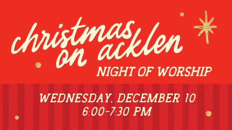 Join us this Wednesday, December 10, from 6:00–7:30 p.m. for Christmas on Acklen: Night of Worship. This special evening will draw our hearts to the hope and beauty of Christ’s coming through Scripture, music, and prayer. Bring your family and join us as we prepare to celebrate the arrival of our Savior together.